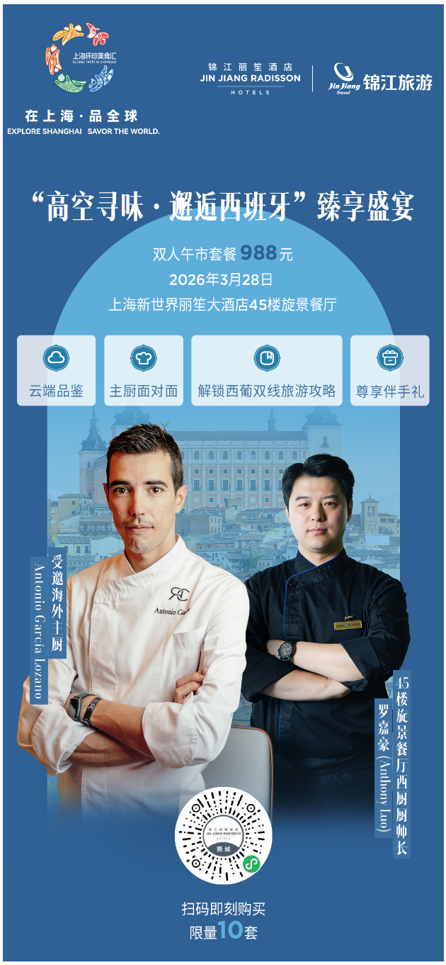 围绕“上海环球美食汇”,锦江丽笙酒店持续推进“海外主厨共创计划”,以跨国主厨交流为载体,探索多元餐饮文化的在地表达。本月28日,锦江丽笙酒店将联动锦江旅游,于上海新世界丽笙大酒店举办“高空寻味·邂逅西班牙臻享盛宴”,活动融合菜单品鉴、主厨交流与目的地推介等多重内容,将餐桌之上的风味延伸至更广阔的文化与旅行语境。