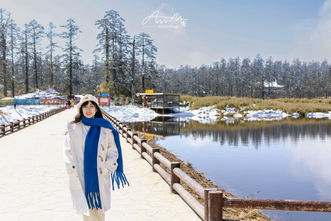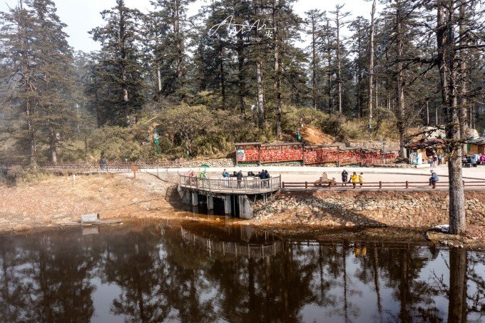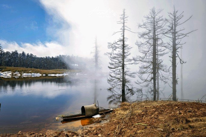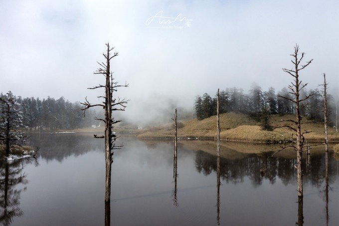 等走到鸳鸯池的时候,太阳出来了,气温升高,云雾在湖面疾驰飘向远方成为温柔云絮一抹,湖水明净透亮,水中树木充满垂直优雅的线条感,坐在湖边晒太阳,幸福感满溢。听说在寒冬这里会出现冰封现象。
