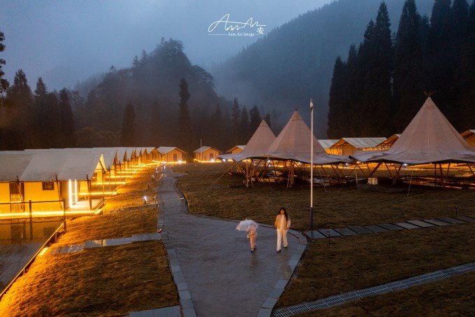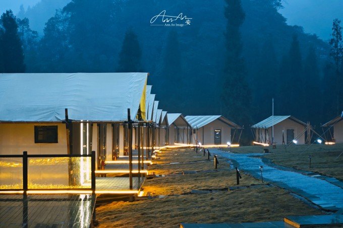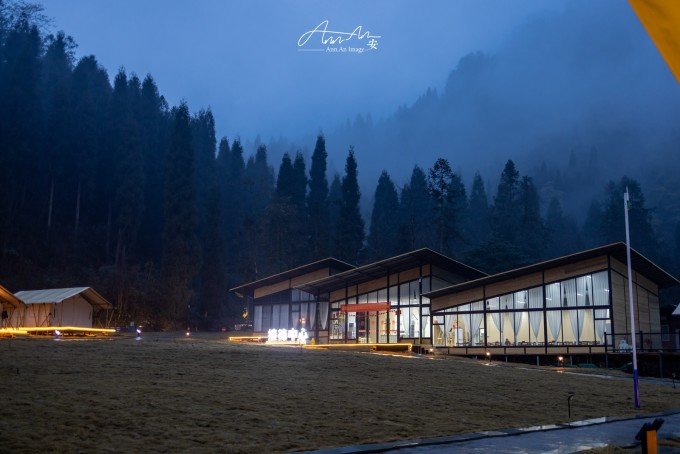 大山脚下的一片营地,夜幕降临,灯光亮起,暖黄色的光在雨夜中影影绰绰。沸腾的羊肉汤锅驱走夜晚的寒气。营地的房间看似简易,走进去房间设施完善,配备了电热毯、地暖,早晨喝一杯咖啡,在阳台上呼吸山中雨后的空气,溪流潺潺,身心得到放松。