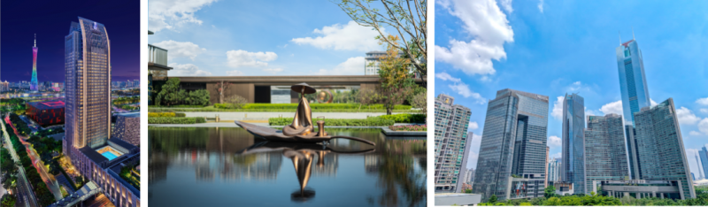 从左到右:广州富力丽思卡尔顿酒店坐拥广州塔景观、广州白云国际会议中心越秀万豪酒店环抱八万平岭南园林、位于天河核心地带的广州海航威斯汀酒店