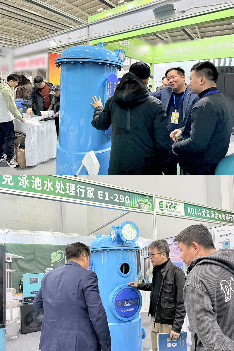 其中,AQUA爱克中压紫外线杀菌器凭借其无化学残留的杀菌特性,吸引了众多采购商的关注。该设备利用紫外线的杀菌特性,无化学残留地杀灭水中有害微生物,守护泳池用水安全。展位工作人员忙碌地为参观者进行产品演示和技术讲解,现场互动频繁,气氛活跃。
