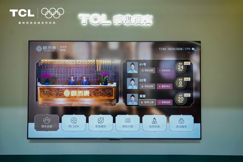 针对酒店服务业的不同细分领域,TCL也展出了定制化解决方案。在疗愈酒店方案中,TCL突出“一台多用”理念,将电视整合为点钟、点餐、智能中控及AI前台的统一入口。通过定制化电视界面模板,助力门店塑造独特品牌形象,并结合AI虚拟人与语音场景联动,为宾客打造沉浸式疗愈空间。配套的Soundbar搭载RAY·DANZ声学专利,提供影院级环绕音效。