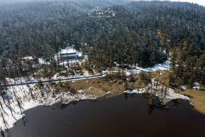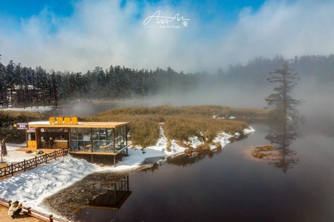 等走到鸳鸯池的时候,太阳出来了,气温升高,云雾在湖面疾驰飘向远方成为温柔云絮一抹,湖水明净透亮,水中树木充满垂直优雅的线条感,坐在湖边晒太阳,幸福感满溢。听说在寒冬这里会出现冰封现象。
