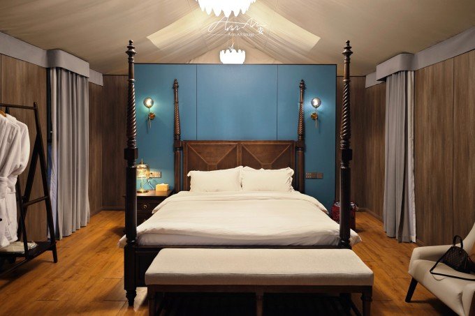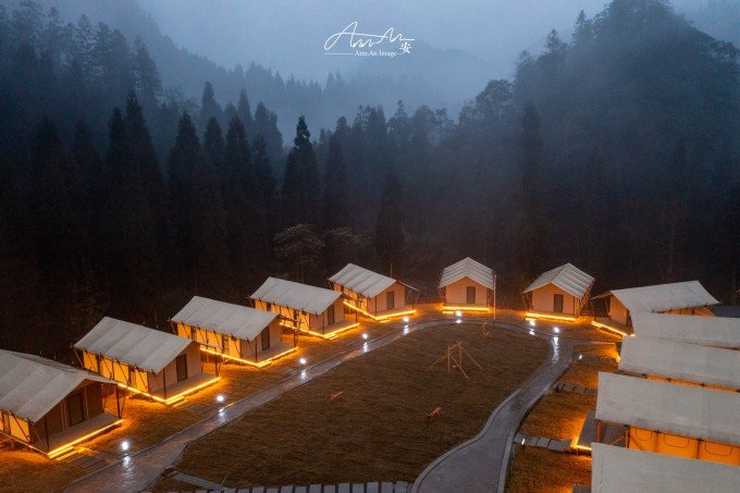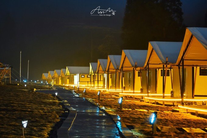 大山脚下的一片营地,夜幕降临,灯光亮起,暖黄色的光在雨夜中影影绰绰。沸腾的羊肉汤锅驱走夜晚的寒气。营地的房间看似简易,走进去房间设施完善,配备了电热毯、地暖,早晨喝一杯咖啡,在阳台上呼吸山中雨后的空气,溪流潺潺,身心得到放松。