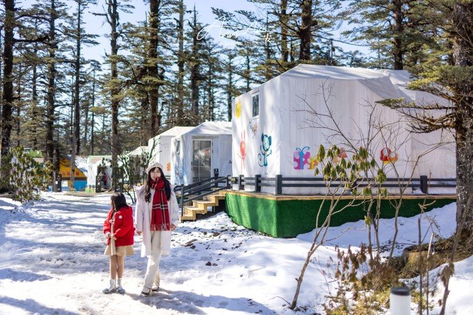 山顶也有住宿的地方,想必是拍摄星空的绝佳地点,一顶一顶的白色帐篷支起来,有机会来这里过夜。有很多玩乐的项目,雪地轮胎,滑雪场,可爱的房子拍照也非常可爱。
