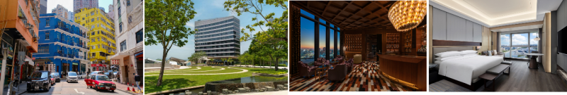 从左到右:入住香港万丽海景酒店踏上”地道精彩发现之旅”、香港数码港艾美酒店大草坪及平店花園开阔绿意空间,澳门新濠影汇W酒店Blind Tiger酒吧、珠海华发万豪酒店艺术中心景观房俯瞰扎哈设计的金湾艺术中心